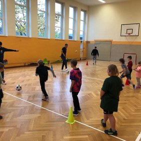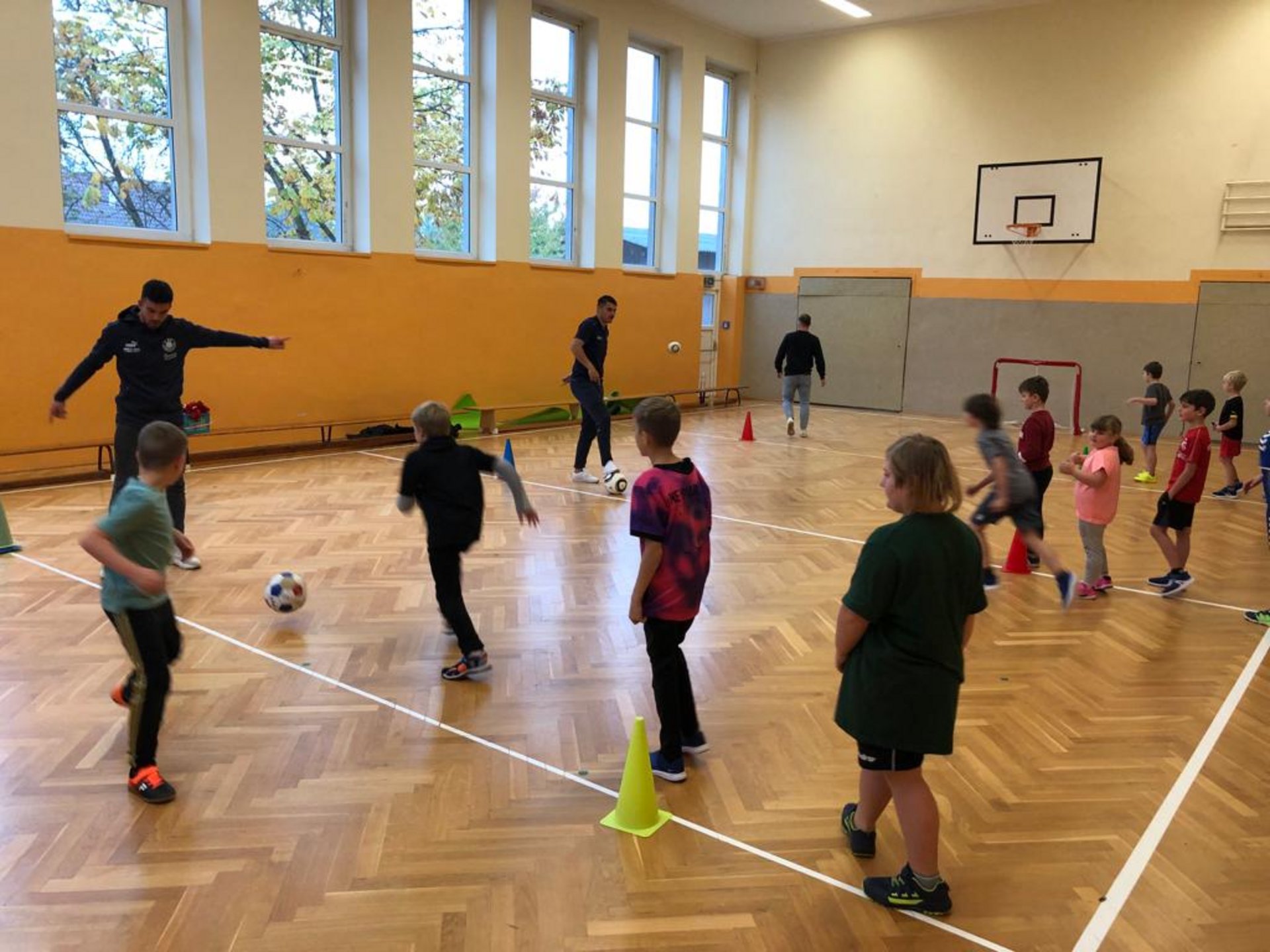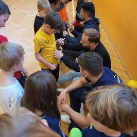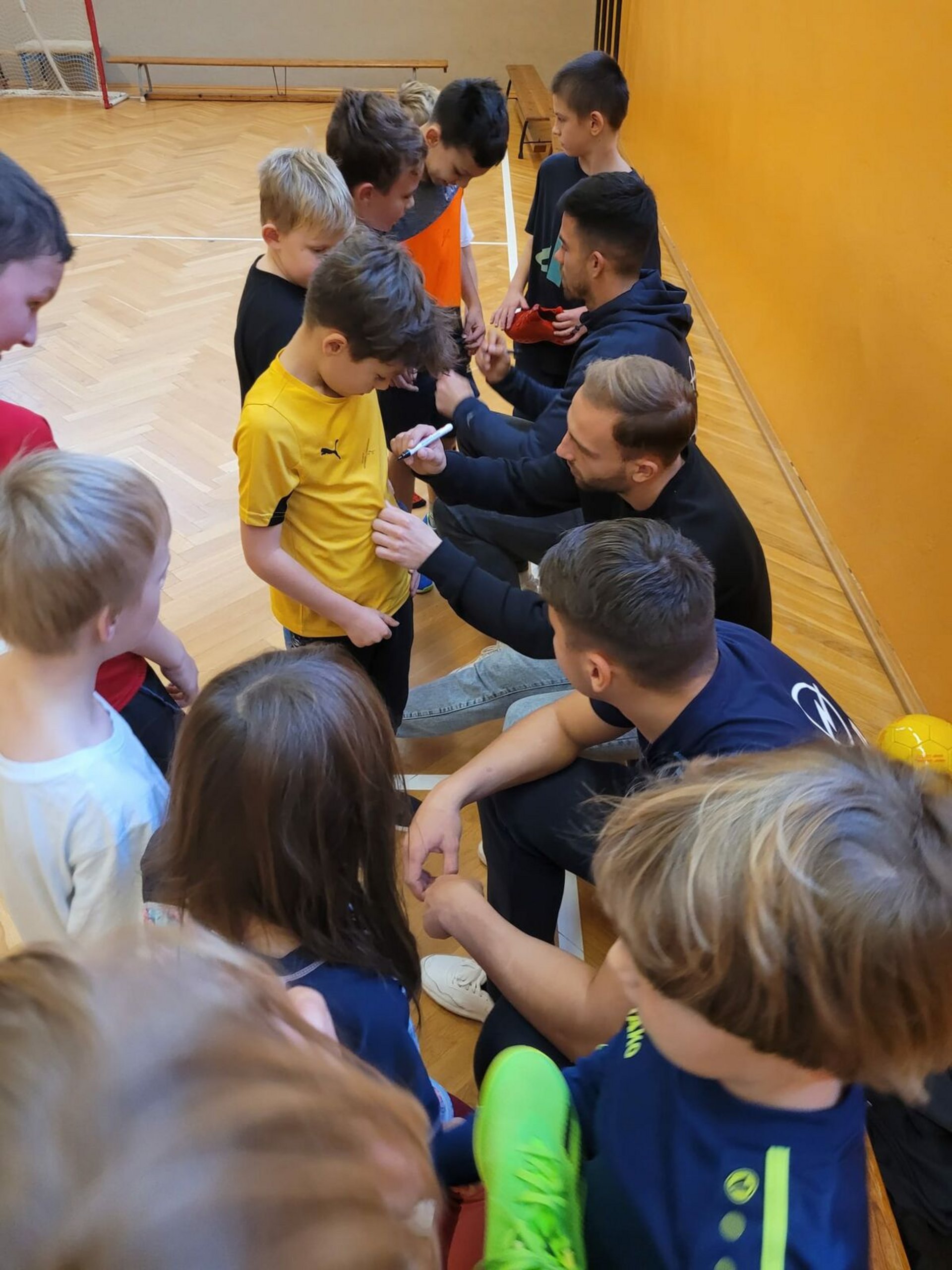 Der darauffolgende Austausch machte allen Beteiligten sichtlich Spaß. Selbstverständlich durfte auch ein kleiner Kick in der Turnhalle mit anschließender Mini-Autogrammstunde nicht fehlen.