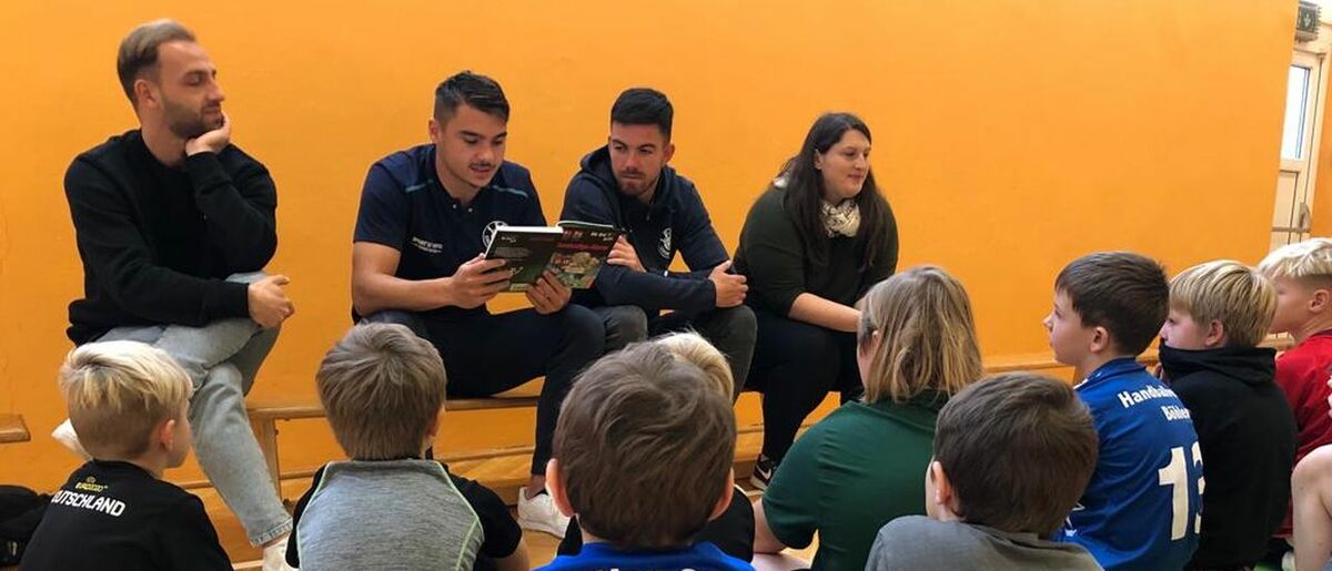 Die Einladung der Grundschule Kitzscher nahmen die Regionalligakicker gern an. Mike Eglseder, Tobias Dombrowa und Julian Weigel lasen Geschichten aus dem Buch „Bundesliga-Alarm“ der 3-Fragezeichen-Reihe von Boris Pfeiffer vor, in der die Meisterschale gestohlen wurde und die Kinderdetektive nun in allen Bundesligavereinen ermitteln müssen.