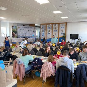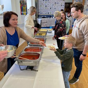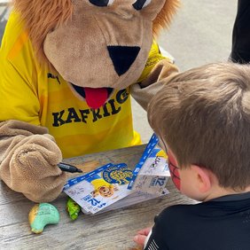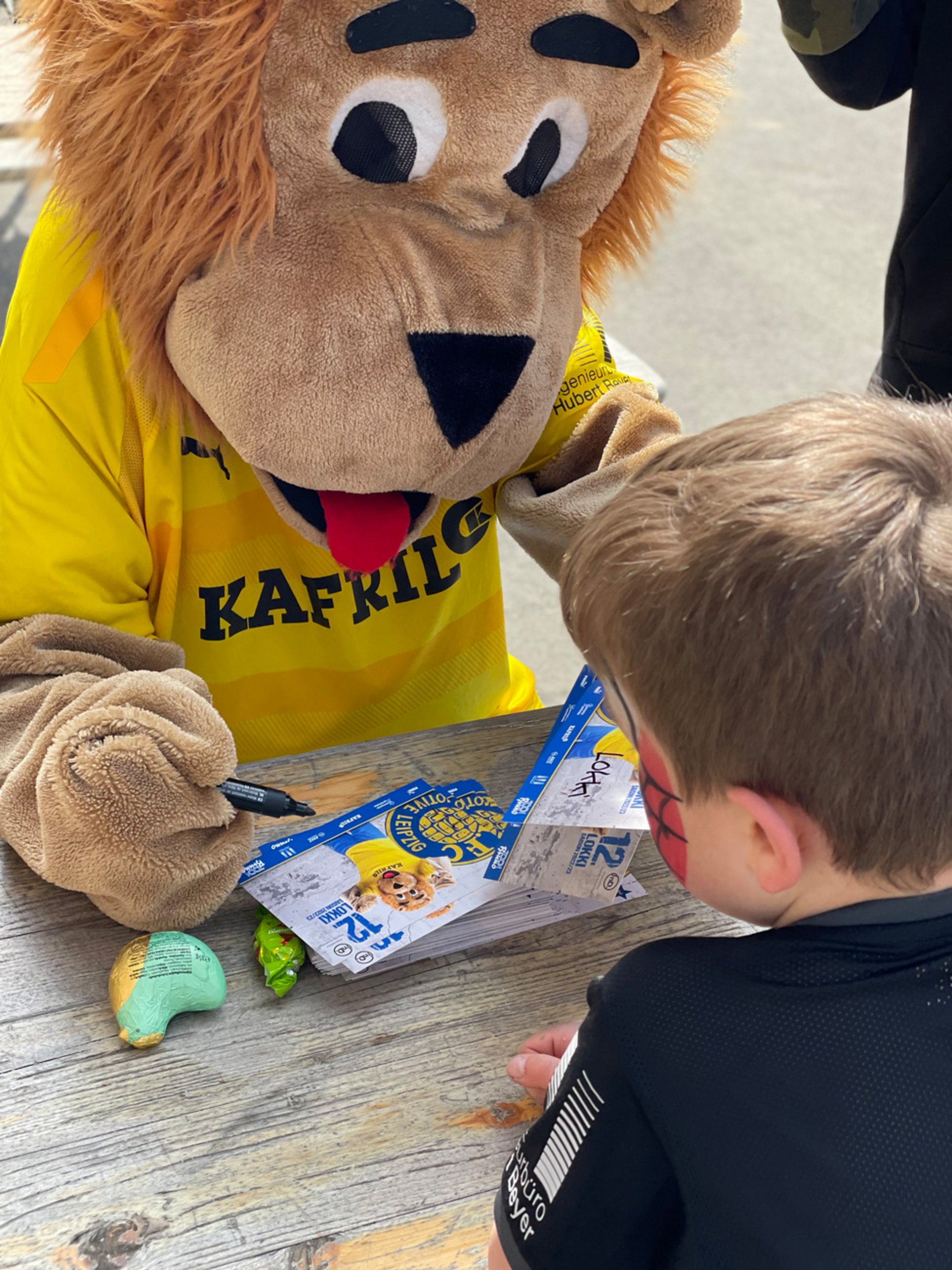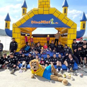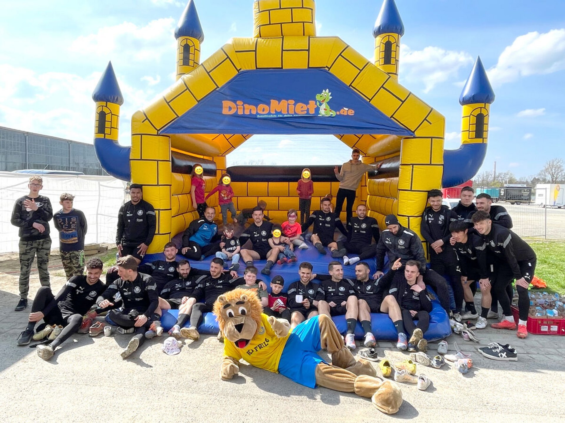 Zum Mittagessen wurden leckere Nudeln mit Tomatensauce serviert. Anschließend konnten die Kinder auf einer Hüpfburg toben, sich schminken lassen oder Fußball spielen. Ein besonderes Highlight war der Besuch beim Training der 1. Herrenmannschaft und das gemeinsame Gruppenfoto. Die Spieler der Mannschaft überreichten allen Kindern zum Abschluss ein prall gefülltes Osterpräsent als Erinnerung an diesen schönen Tag.