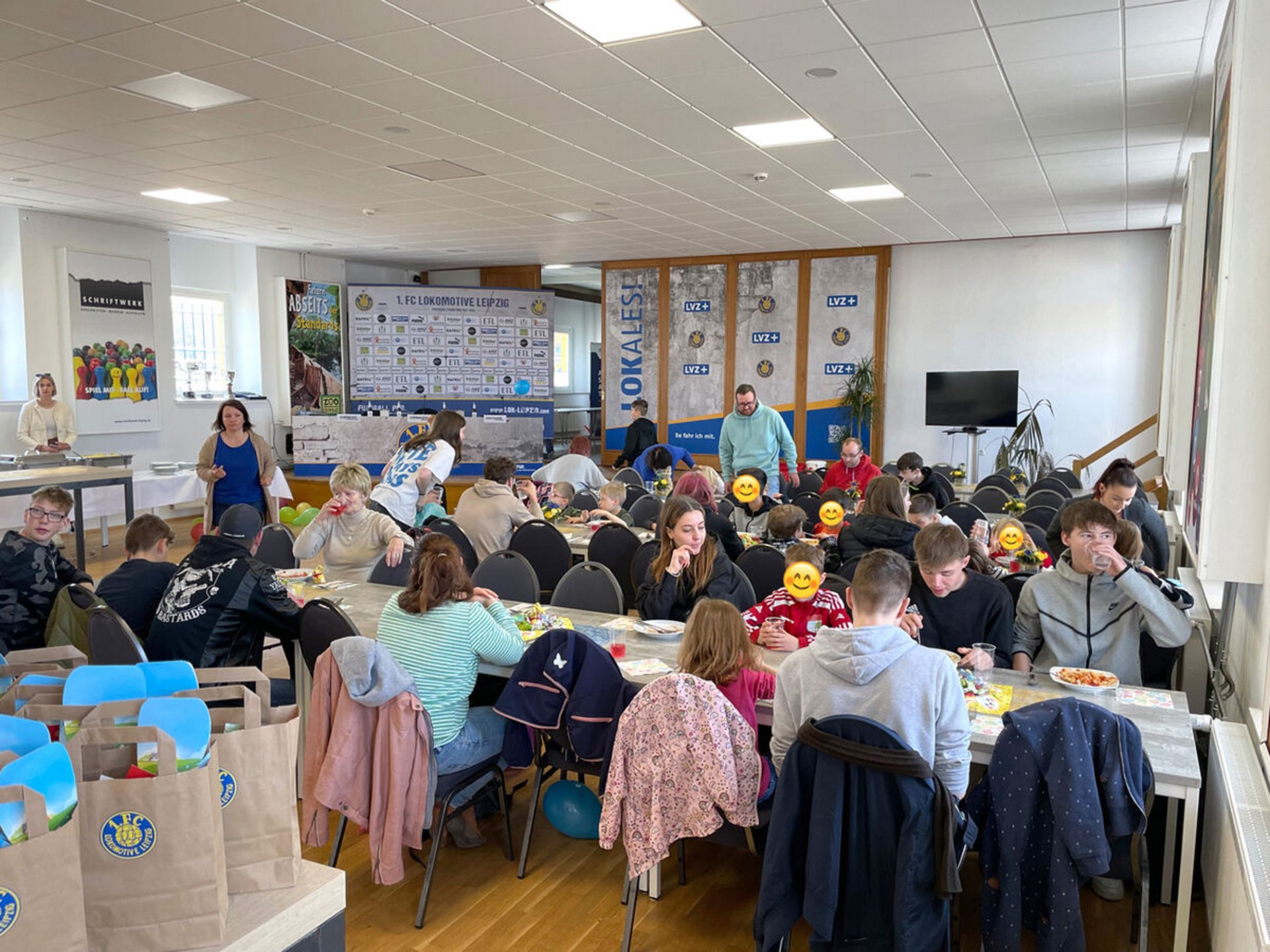 Der 1. FC Lokomotive Leipzig hat am Ostermontag ein Osteressen für sozial benachteiligte Kinder veranstaltet. Insgesamt folgten über 40 Kinder und Betreuer von verschiedenen Kinderheimen in Machern, den Kinderhäusern in Lützschena und Stahmeln, dem Projekt Stabil aus der Riebeckstraße 1 in Leipzig und dem Verein Straßenkinder Leipzig e.V. der Einladung und kamen ins Bruno-Plache-Stadion.